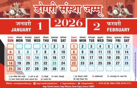 Digital Download Dogri Sanstha Jammu Releases Dogri-English Calendar 2026 Dogri Sanstha Jammu released its Calendar for the year 2026. The calendar is in Dogri as well as English and shows all Government holidays along with the important festivals, fairs Shashi Pathania2 days agoKeep Reading